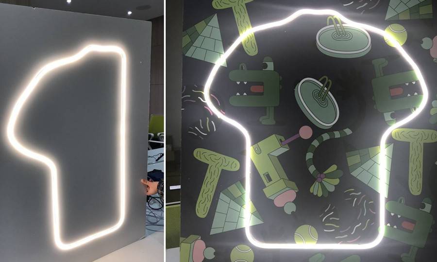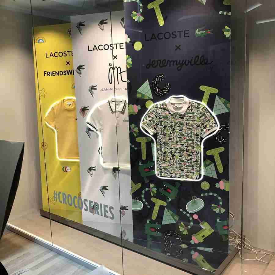 Using flexible LED neon strip to fix the special shape of T-shirt window display for LACOSTE brand.